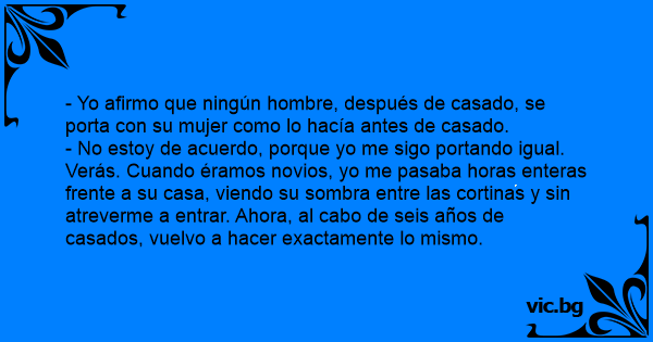 - No estoy de acuerdo, porque yo me sigo portando igual. Verás. Cuando éramos novios, yo me pasaba horas enteras frente a su casa, viendo su sombra entre las cortinas y sin atreverme a entrar. Ahora, al cabo de seis años de casados, vuelvo a hacer exactamente lo mismo.