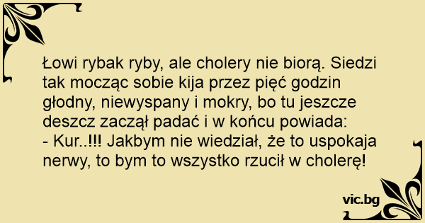 Łowi rybak ryby, ale cholery nie biorą. Siedzi tak mocząc sobie kija przez pięć godzin głodny, niewyspany i mokry, bo tu jeszcze deszcz zaczął padać i w końcu powiada: