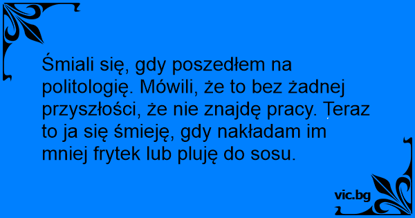 Śmiali się, gdy poszedłem na politologię. Mówili, że to bez żadnej przyszłości, że nie znajdę pracy. Teraz to ja się śmieję, gdy nakładam im mniej frytek lub pluję do sosu.