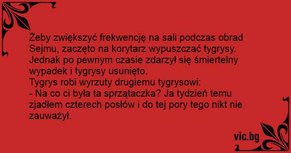 - Na co ci była ta sprzątaczka? Ja tydzień temu zjadłem czterech posłów i do tej pory tego nikt nie zauważył.