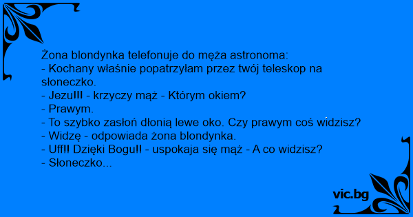- Jezu!!! - krzyczy mąż - Którym okiem?