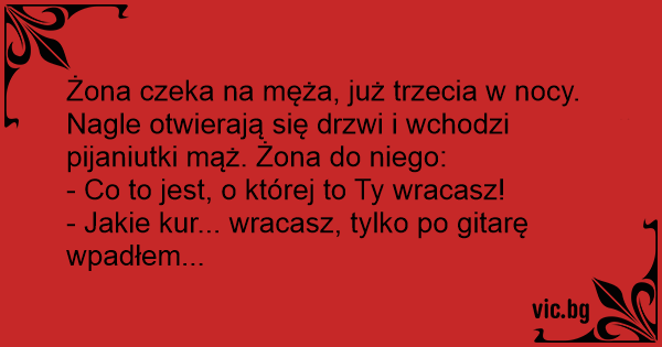 Żona czeka na męża, już trzecia w nocy. Nagle otwierają się drzwi i wchodzi pijaniutki mąż. Żona do niego: