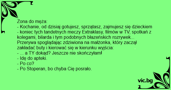 - Kochanie, od dzisiaj gotujesz, sprzątasz, zajmujesz się dzieckiem - koniec tych tandetnych meczy Extraklasy, filmów w TV, spotkań z kolegami, bilarda i tym podobnych błazeńskich rozrywek...