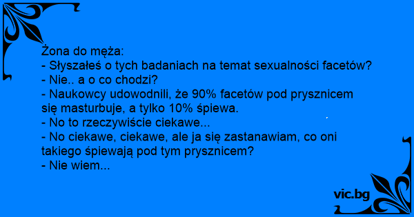 - Naukowcy udowodnili, że 90% facetów pod prysznicem się masturbuje, a tylko 10% śpiewa.