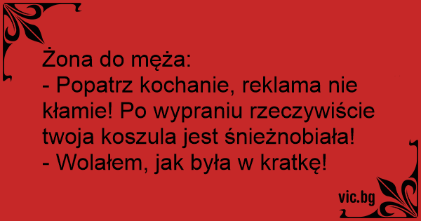 - Popatrz kochanie, reklama nie kłamie! Po wypraniu rzeczywiście twoja koszula jest śnieżnobiała!