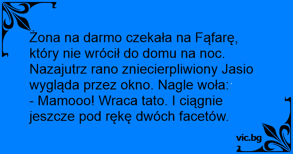Żona na darmo czekała na Fąfarę, który nie wrócił do domu na noc. Nazajutrz rano zniecierpliwiony Jasio wygląda przez okno. Nagle woła:
