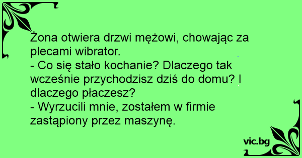 Żona otwiera drzwi mężowi, chowając za plecami wibrator.