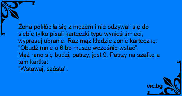 Żona pokłóciła się z mężem i nie odzywali się do siebie tylko pisali karteczki typu wynieś śmieci, wyprasuj ubranie. Raz mąż kładzie żonie karteczkę: