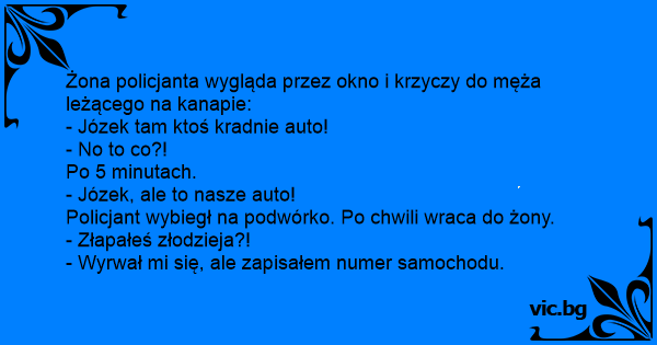Policjant wybiegł na podwórko. Po chwili wraca do żony.