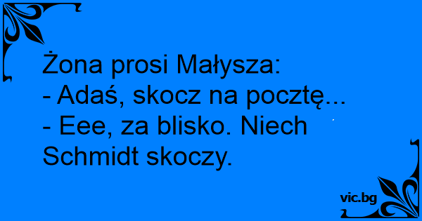 Żona prosi Małysza: - Adaś, skocz na pocztę... - Eee, za blisko. Niech Schmidt skoczy.