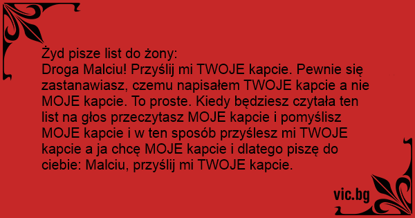 Droga Malciu! Przyślij mi TWOJE kapcie. Pewnie się zastanawiasz, czemu napisałem TWOJE kapcie a nie MOJE kapcie. To proste. Kiedy będziesz czytała ten list na głos przeczytasz MOJE kapcie i pomyślisz MOJE kapcie i w ten sposób przyślesz mi TWOJE kapcie a ja chcę MOJE kapcie i dlatego piszę do ciebie: Malciu, przyślij mi TWOJE kapcie.