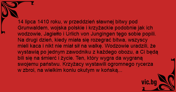 14 lipca 1410 roku, w przeddzień sławnej bitwy pod Grunwaldem, wojska polskie i krzyżackie podobnie jak ich wodzowie, Jagiełło i Urlich von Jungingen tęgo sobie popili. Na drugi dzień, kiedy miała się rozegrać bitwa, wszyscy mieli kaca i nikt nie miał sił na walkę. Wodzowie uradzili, że wystawią po jednym zawodniku z każdego obozu, a Ci będą bili się na śmierć i życie. Ten, który wygra da wygraną swojemu państwu. Krzyżacy wystawili ogromnego rycerza w zbroi, na wielkim koniu okutym w końską zbroję. Jagiełło wszedł do polskiego obozu i zapytał:
