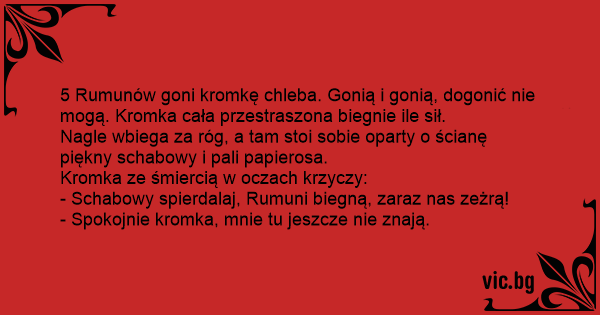 5 Rumunów goni kromkę chleba. Gonią i gonią, dogonić nie mogą. Kromka cała przestraszona biegnie ile sił.