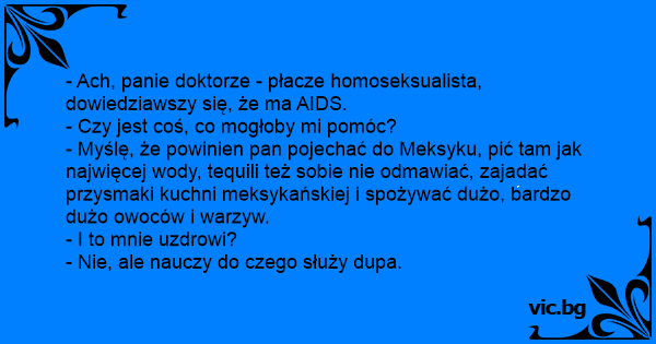 - Ach, panie doktorze - płacze homoseksualista, dowiedziawszy się, że ma AIDS.