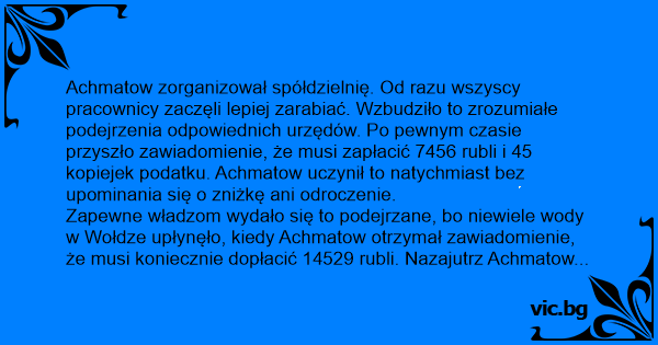 Zapewne władzom wydało się to podejrzane, bo niewiele wody w Wołdze upłynęło, kiedy Achmatow otrzymał zawiadomienie, że musi koniecznie dopłacić 14529 rubli. Nazajutrz Achmatow wpłacił wszystko, co do kopiejki. Kolejny podatek w wysokości 43789 rubli i 50 kopiejek uiścił w ciągu trzech dni, ale w terminie!