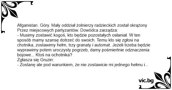 - Zostanę ale pod warunkiem, że nie zostawicie mi jednego hełmu i trzech granatów, a trzy hełmy i jeden granat.