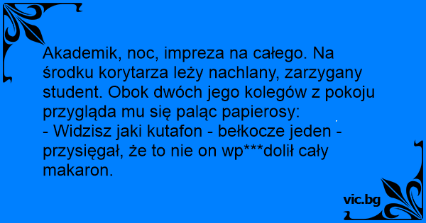 - Widzisz jaki kutafon - bełkocze jeden - przysięgał, że to nie on wp***dolił cały makaron.
