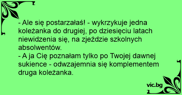 - Ale się postarzałaś! - wykrzykuje jedna koleżanka do drugiej, po dziesięciu latach niewidzenia się, na zjeździe szkolnych absolwentów.