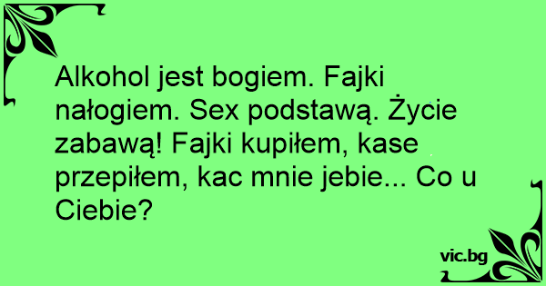 Alkohol jest bogiem. Fajki nałogiem. Sеx podstawą. Życie zabawą! Fajki kupiłem, kase przepiłem, kac mnie jebie... Co u Ciebie?