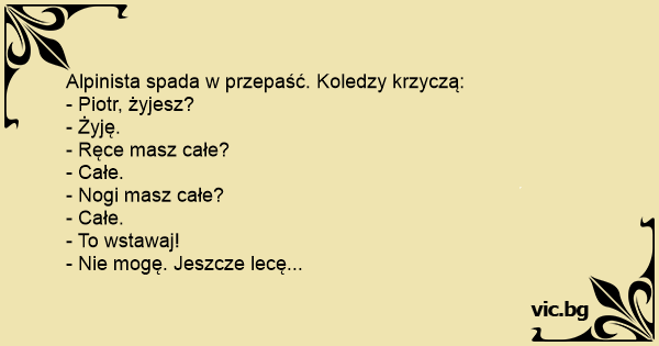 Két hegymászó kalandozik a Himalája szikláin, mikor egyikük egy szakadékba esik. A társa utánakiált: - Nem ütötted meg magad? - Nem. - Kezed, lábad nem tört el? - Nem. - Akkor gyere, mássz ki és...