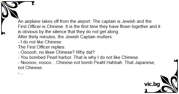 Un piloto chino y un copiloto judio comparten un vuelo por primera vez. Desde el principio se nota cierta antipatia, a lo que el chino le pregunta: