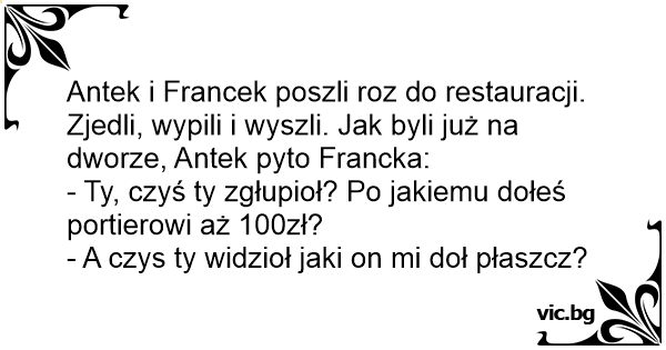 Antek i Francek poszli roz do restauracji. Zjedli, wypili i wyszli. Jak byli już na dworze, Antek pyto Francka: