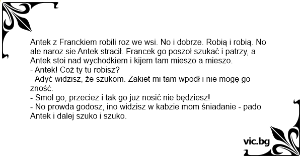 Antek z Franckiem robili roz we wsi. No i dobrze. Robią i robią. No ale naroz sie Antek stracił. Francek go poszoł szukać i patrzy, a Antek stoi nаd wychodkiem i kijem tam mieszo a mieszo.