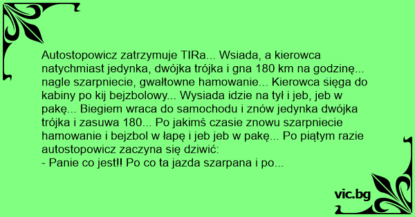 Autostopowicz zatrzymuje TIRa... Wsiada, a kierowca natychmiast jedynka, dwójka trójka i gna 180 km na godzinę... nagle szarpniecie, gwałtowne hamowanie... Kierowca sięga do kabiny po kij bejzbolowy... Wysiada idzie na tył i jeb, jeb w pakę... Biegiem wraca do samochodu i znów jedynka dwójka trójka i zasuwa 180... Po jakimś czasie znowu szarpniecie hamowanie i bejzbol w łapę i jeb jeb w pakę... Po piątym razie autostopowicz zaczyna się dziwić: