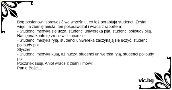 Bóg postanowił sprawdzić we wrześniu, co też porabiają studenci. Zesłał więc na ziemię anioła, ten posprawdzał i wraca z raportem: