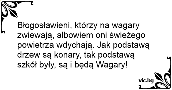 Błogosławieni, którzy na wagary zwiewają, albowiem oni świeżego powietrza wdychają. Jak podstawą drzew są konary, tak podstawą szkół były, są i będą Wagary!