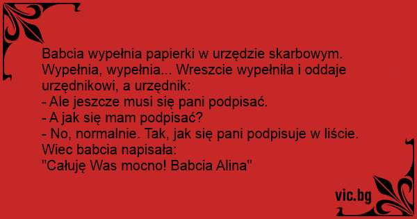 Babcia wypełnia papierki w urzędzie skarbowym. Wypełnia, wypełnia... Wreszcie wypełniła i oddaje urzędnikowi, a urzędnik: