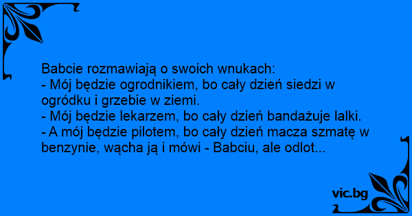 - A mój będzie pilotem, bo cały dzień macza szmatę w benzynie, wącha ją i mówi - Babciu, ale odlot...