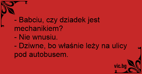 - Бабо, дядо да не е автомонтьор? - Не, защо? - Защото лежи под един камион на улицата