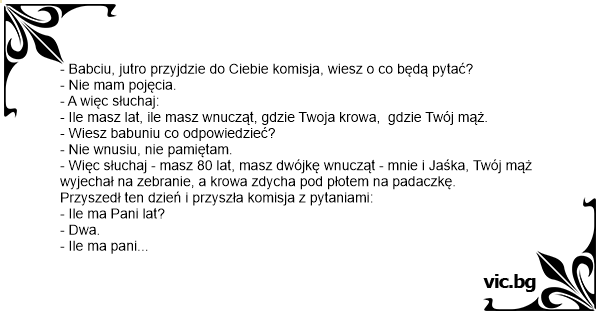 - Babciu, jutro przyjdzie do Ciebie komisja, wiesz o co będą pytać?