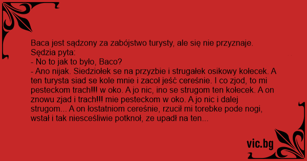 - Ano nijak. Siedziołek se na przyzbie i strugałek osikowy kołecek. A ten turysta siad se kole mnie i zacoł jeść cereśnie. I co zjod, to mi pesteckom trach!!! w oko. A jo nic, ino se strugom ten kołecek. A on znowu zjad i trach!!! mie pesteckom w oko. A jo nic i dalej strugom... A on łostatniom cereśnie, rzucił mi torebke pode nogi, wstał i tak niesceśliwie potknoł, ze upadł na ten kołecek, com go strugoł. I tak, panie, coś ze 27 razy...