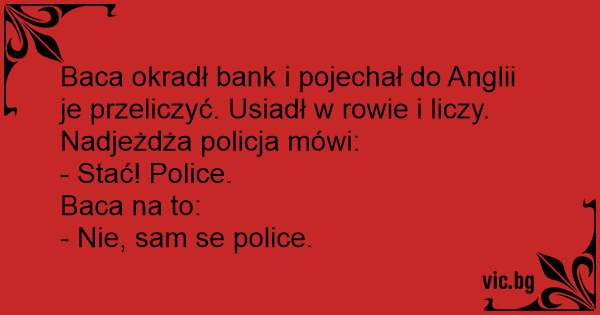 Baca okradł bank i pojechał do Anglii je przeliczyć. Usiadł w rowie i liczy. Nadjeżdża policja mówi: