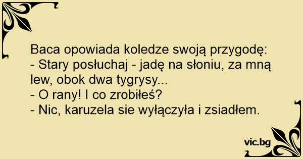 - Stary posłuchaj - jadę na słoniu, za mną lew, obok dwa tygrysy...