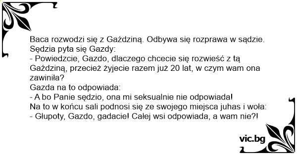 - Powiedzcie, Gazdo, dlaczego chcecie się rozwieść z tą Gaździną, przecież żyjecie razem już 20 lat, w czym wam ona zawiniła?