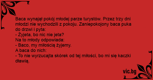 Baca wynajął pokój młodej parze turystów. Przez trzy dni młodzi nie wychodzili z pokoju. Zaniepokojony baca puka do drzwi i pyta: