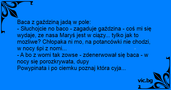 - Słuchojcie no baco - zagaduje gaździna - coś mi się wydaje, ze nasa Maryś jest w ciązy... tylko jak to mozliwe? Chłopaka ni mo, na potancówki nie chodzi, w nocy śpi z nomi...