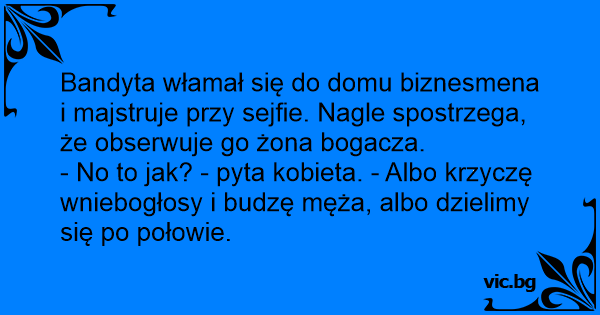 - No to jak? - pyta kobieta. - Albo krzyczę wniebogłosy i budzę męża, albo dzielimy się po połowie.