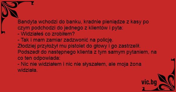 Είδες τίποτε; Мутра влиза и обира банка. Пита Свидетел: A robber robs a bank, gets all the money and is about to leave, but before that he asks a customer who’s lying on the floor, “Have you seen me rob this bank?” Бандит ограбва банка и взима заложници. Пита първия: A bank robber wanted to keep his identity secret, but didn't wear a balaclava. He told all in the bank not to look at him or he would shoot them. One foolhardy customer sneaked a look, and the robber promtply shot him. The robber asked if anyone else had seen his face. One customer, gazing... Kommt ein Mann mit einer Waffe in die Bank und kassiert alles Bargeld. Den daneben stehenden Mann fragt er: "Haben Sie gesehen, dass ich die Bank ausgeraubt habe?" "Ja, ich habe es gesehen." Der Bankräuber erschiesst den Mann. Zum nächsten Mann: "Haben Sie gesehen, dass ich die Bank ausgeraubt... Um perigoso ladrão entra armado em um banco. Assustando os clientes, vai até o atendente e exige todo o dinheiro do caixa. Com a quantia em mão, ele se volta para um dos clientes e pergunta: — Você me viu roubar esse banco? Com a voz trêmula, ele responde: — Sim, eu vi. Sem pensar duas vezes o... A masked man walks into a bank and holds it up at gunpoint to rob the bank. In the process of robbing the bank, his mask fell off. He quickly put it back on his face and asked the teller directly... A man with a gun goes into a bank and demands for money. Once he is given the money, he turns to a customer and asks, “Did you see me rob this bank?” The man replied, “Yes sir, I did.” The robber... Un rapinatore, durante una rapina in banca, ha un'inconveniente: Gli scivola la maschera per qualche secondo. Subito provvede a coprirsi di nuovo, ma poco dopo, nel dubbio, chiede ad un cliente: -...