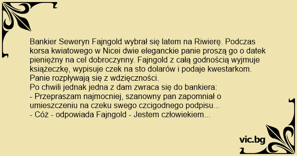 Bankier Seweryn Fajngold wybrał się latem na Riwierę. Podczas korsa kwiatowego w Nicei dwie eleganckie panie proszą go o datek pieniężny na cel dobroczynny. Fajngold z całą godnością wyjmuje książeczkę, wypisuje czek na sto dolarów i podaje kwestarkom. Panie rozpływają się z wdzięczności.