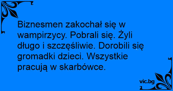Biznesmen zakochał się w wampirzycy. Pobrali się. Żyli długo i szczęśliwie. Dorobili się gromadki dzieci. Wszystkie pracują w skarbówce.