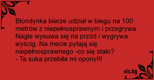 Blondynka bierze udział w biegu na 100 metrów z niepełnosprawnym i przegrywa. Nagle wysuwa się na przód i wygrywa wyścig. Na mecie pytają się niepełnosprawnego -co się stało?