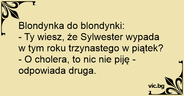 тази нова година се пада петък Weihnachten am Freitag Две блондинки си говорят и едната казва: Две блондинки разговарят. Treffen sich 2 Blondinen, sagt die Eine: Unterhalten sich zwei Blondinen. Fragt die eine: "An welchem Tag ist eigentlich Heilig Abend?" Sagt die andere: "An einem Freitag!" Darauf meint die erste: "Mist, hoffentlich nicht der 13." Zwei Polizisten unterhalten sich: "Du, stell Dir vor, dieses Jahr fällt Sylvester auf einen Freitag!" Darauf der andere: "Ohje, womöglich auch noch auf den Dreizehnten?!" Spotykają się dwie blondynki i jedna mówi: - Ty, słuchaj wiesz, że w tym roku Sylwester wypada w piątek? A na to druga: - Kurcze, żeby tylko nie trzynastego. Harald till Björn: - Julafton är på en fredag i år. - Oj, bara det inte är den 13:de. Twee blondjes zitten wat te kletsen tot ineens de ene zegt “Dit jaar is kerstmis op een vrijdag” waarop het andere blondje antwoordt “O nee, hopelijk is het dan niet de 13e!” Paddy says to Mick,  “Christmas is on a Friday this year”…. Mick says “Let’s hope it’s not the 13th.” Den ene blondine til den andre: – Ååå, det er jul på en fredag i år. Den andre: Åhh nei, bare det ikke blir den 13. Den ene blondine til den anden: Åhh gud. det er jul på en fredag i år. Den anden: Åhh nej! bare det ikke er den 13. Ene blondje: "Dit keer is oudjaar op een vrijdag." Andere blondje: "Nou, hopelijk niet op de 13de..." Розмовляють дві блондинки: — Чуєш, Маринко, в цьому року 8 березня буде в п'ятницю! — Невже?! Тільки б не тринадцятого!!! Sagt die eine Blondine zur anderen: Weihnachten fällt dieses Jahr auf einen Freitag! Sagt die andere: Oh nein! Hoffentlich nicht auf den 13ten To blondiner står og snakker, den ene siger: Juleaften ligger i år på en fredag. Den anden: Uha nu er det vel ikke d.13…?! De ene blondine zegt tegen de andere: 'Dit jaar valt Kerstmis op een vrijdag.' Zegt de andere: 'Oh! Hopelijk niet op de 13de!' Két szőke nő beszélget. - Képzeld idén a karácsony pont pénteki napra esik! - De remélem nem 13-ára... Jdou dvě blondýnky po ulici a jedna prohodí: „Víš, že tenhle rok vycházejí Vánoce na pátek?” Druhá se zalekne: „Doufám, že ne třináctého?!” Deux blondes discutent : - Cette année Noël tombe un vendredi L'autre repond : - J'espère que c'est pas un vendredi 13 Két rendőr beszélget: - Tudtad, hogy idén péntekre esik a szilveszter? Mire a másik: - Remélem nem tizenharmadika! Дві білявки: — А ти знаєш, що цього року Новий рік припадає на п’ятницю?! — Ой. Лише б не п’ятниця 13-те… Си разговараат две плавуши: - Знаеш ли дека оваа година Нова Година се паѓа во Петок? Другата: - Ауу само да не е 13ти!!! Šnekas dvi blondinės: - Žinai šiemet nauji metai penktadineį.. - Kad tik nebūtu 13.. Mann: "Heute fällt Weihnachten auf einen Freitag". Blondine: "Hoffentlich nicht auf Freitag den 13ten." Зборуваат две плавуши: - Оваа година Нова Година е во петок, вели првата. - Само да не биде Петок 13, одговара втората. Našle se dve plavuše i kaže jedna drugoj: - Da li znaš da Nova godina pada tačno na petak! A druga će: - Jao nadam se da nije petak 13.