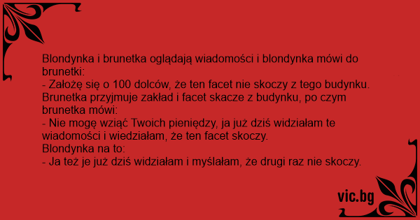 Brunetka przyjmuje zakład i facet skacze z budynku, po czym brunetka mówi: