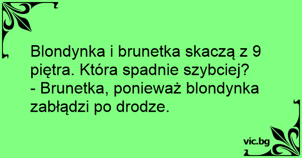 Blondynka i brunetka skaczą z 9 piętra. Która spadnie szybciej? - Brunetka, ponieważ blondynka zabłądzi po drodze.