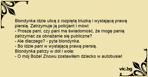 Blondynka idzie ulicą z rozpiętą bluzką i wystającą prawą piersią. Zatrzymuje ją policjant i mówi: