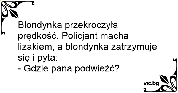 Blondynka przekroczyła prędkość. Policjant macha lizakiem, a blondynka zatrzymuje się i pyta: